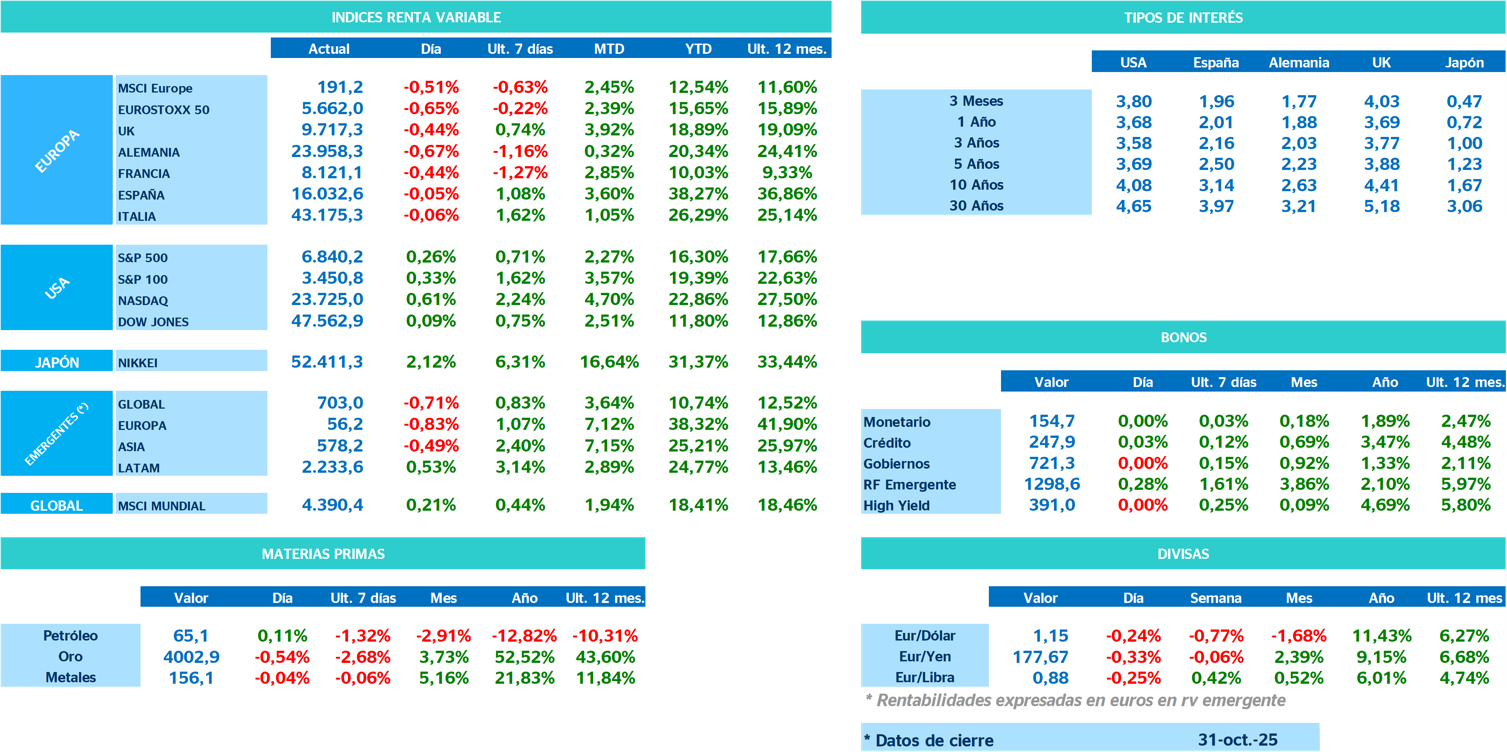 En Europa, el tono es más estable. La zona euro sorprendió con un crecimiento trimestral del 0,2%, impulsado por la fortaleza del consumo en Francia y España. Los precios, por su parte, se mantienen cerca del objetivo del 2%, con una inflación subyacente que resiste en el 2,4%. Estos datos refuerzan la percepción del Banco Central Europeo de que “está en un buen lugar”. Tras meses de debate interno, la entidad parece dispuesta a mantener los tipos sin cambios durante un tiempo prolongado, eliminando del horizonte inmediato cualquier expectativa de nuevos recortes. La combinación de crecimiento modesto y estabilidad de precios sugiere que la política monetaria en Europa ha alcanzado una meseta: ni la actividad justifica estímulos adicionales ni la inflación exige endurecimiento.