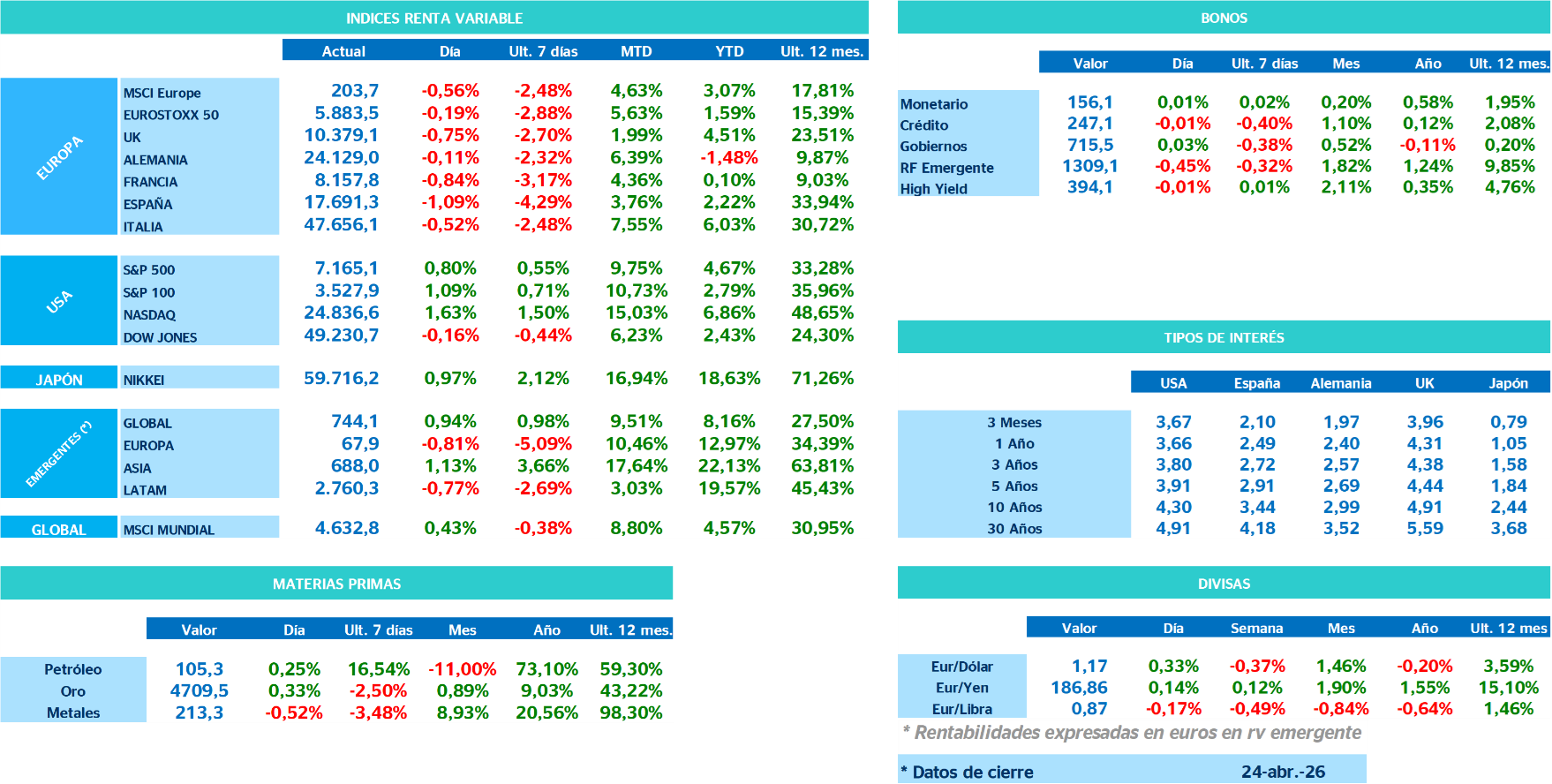 En los mercados financieros emerge una tensión difícil de ignorar. Por una parte, los activos de riesgo continúan comportándose con solidez, respaldados por la confianza en que el conflicto no se intensifique y por el impulso de dinámicas estructurales de crecimiento que siguen vigentes, particularmente la derivada de la inteligencia artificial. Por otra, el riesgo no ha desaparecido: la volatilidad subyacente permanece contenida pero presente, y las valoraciones incorporan en gran medida un escenario favorable. Como consecuencia, el espacio para ajustes bruscos ante noticias adversas sigue siendo significativo.