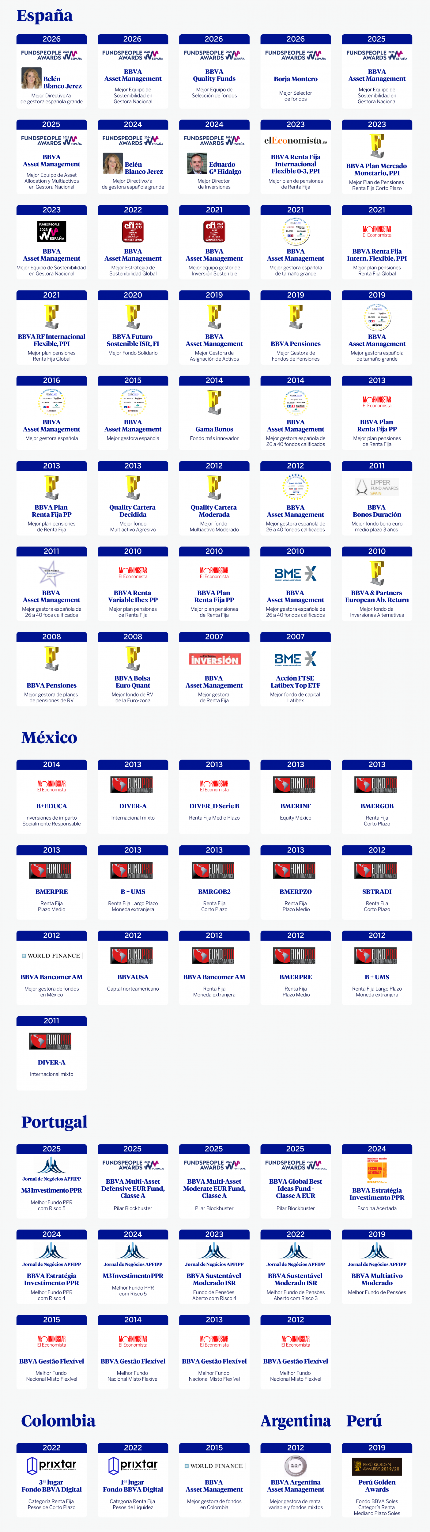 La excelencia en la labor que viene realizando BBVA Asset Management desde hace más de 40 años, es reconocida anualmente por la industria. Así, BBVA Asset Management recibe numerosos galardones, tanto en Europa como en América Latina, hecho que prueba de manera objetiva el compromiso de BBVA Asset Management con la gestión de activos seria y rentable para sus clientes.