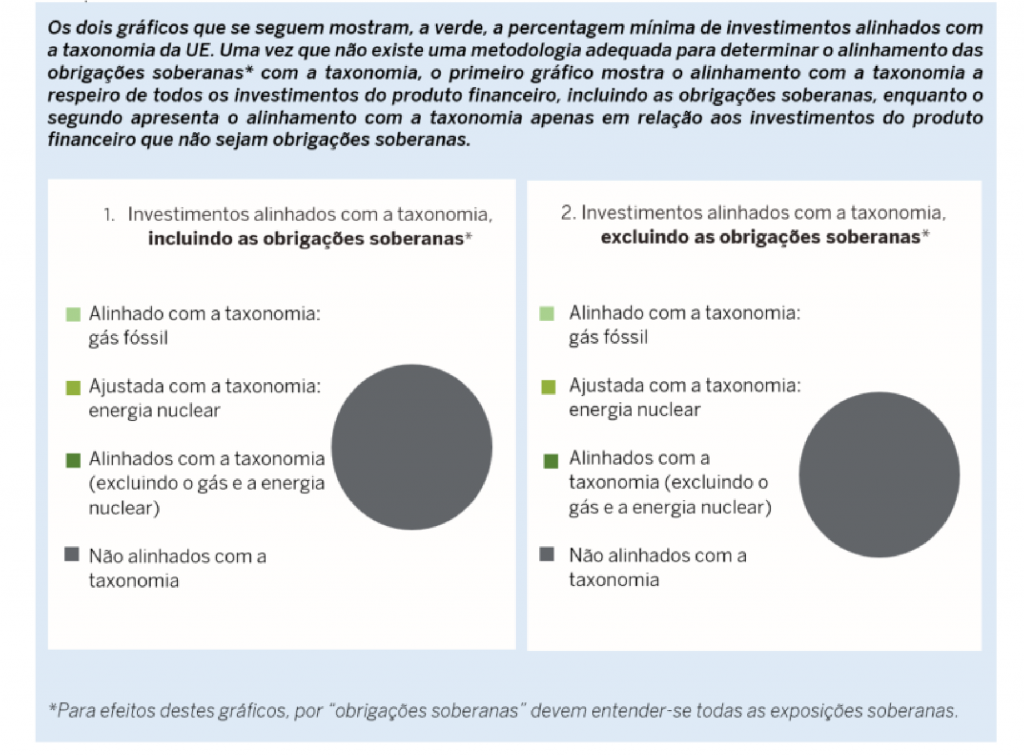 Desta forma, também não foi determinado uma proporção mínima de investimentos sustentáveis com um objetivo ambiental que não se ajustem à taxonomia da UE, dada a escassa informação disponível relacionada com o alinhamento de atividades, encargos de investimento e operativos dos diferentes emitentes e empresas com respeito à taxonomia da EU.